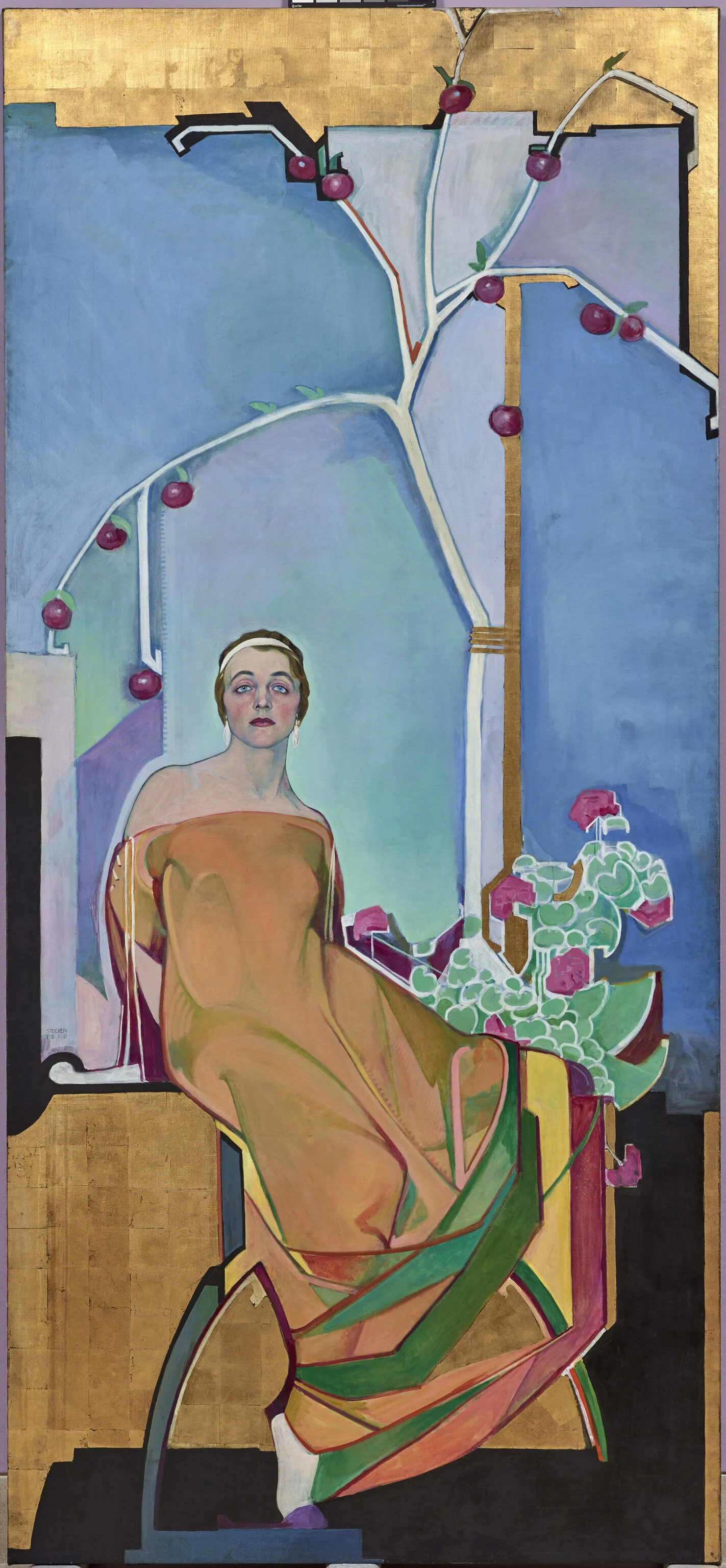 Seven large interconnected murals were created for the Meyer family for a home they never used. The large, gold-leafed murals are filled with portraits of Steichen's friends and their floral counterparts, making this project a particularly personal one for the artist. The murals spent many years in storage and are now owned by the Art Bridges Foundation, which conserved them and have made them available for display in several museums across the United States.