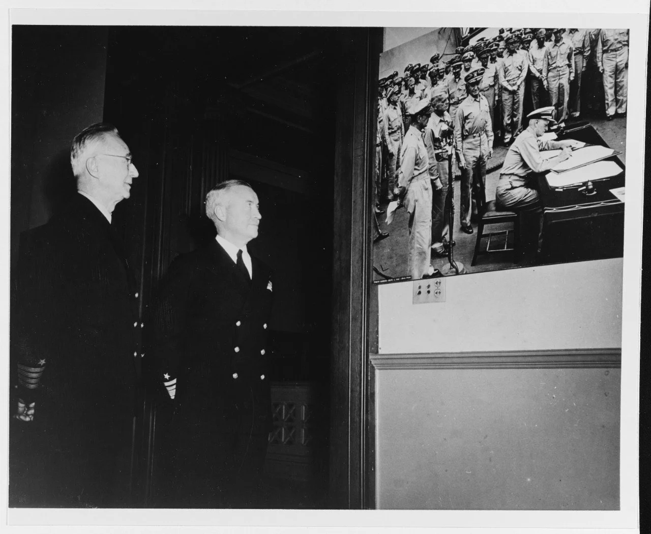 Image: Captain Edward Steichen escorts Rear Admiral Forrest P. Sherman through the Navy War Photograph exhibit at the Corcoran Art Gallery, Washington, D.C., 6 December 1945. They are viewing a photograph of Fleet Admiral Chester Nimitz signing the Japanese instrument of surrender on board USS MISSOURI on 2 September 1945. National Archives